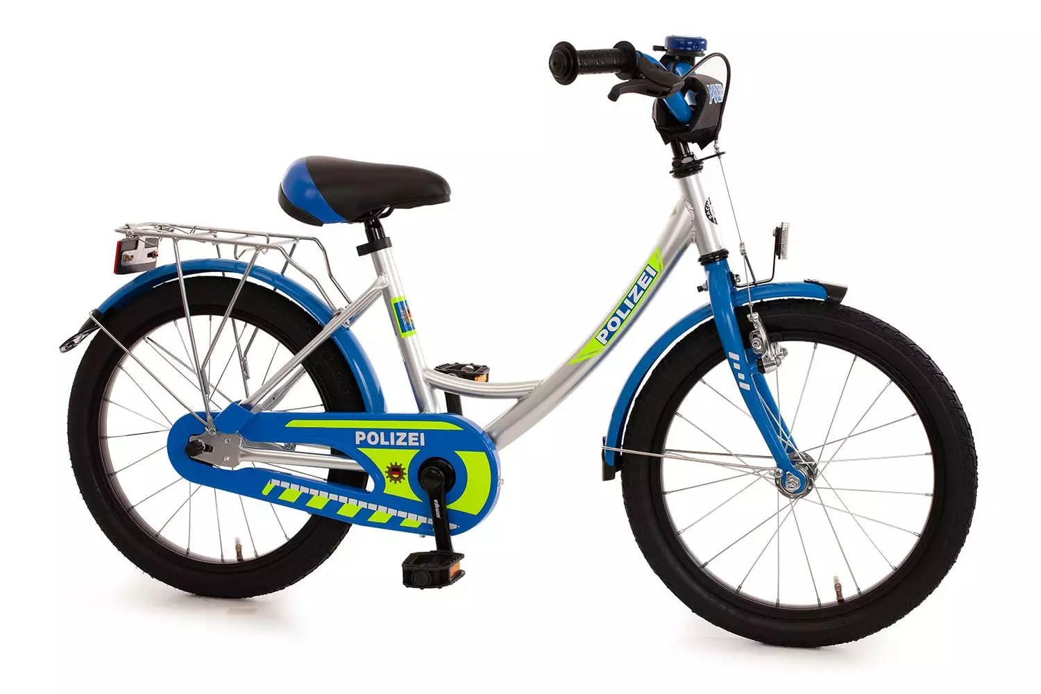 Das Bachtenkirch Polizei Kinderfahrrad, hier in der Version mit 18 Zoll Laufrädern, kommt im original Polizei-Design angefahren.